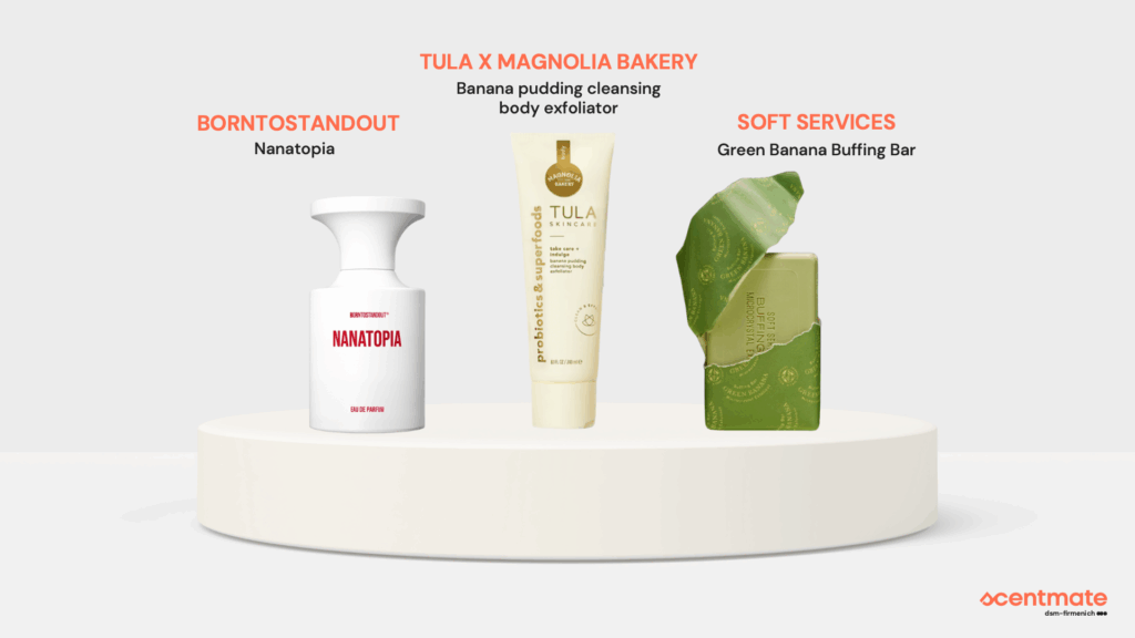 These examples show how the banana gourmand fragrance trend for autumn 2025 is being used not just in fragrance, but across skincare and body care, often paired with exfoliating ingredients like AHAs and lemon peel to enhance the sensorial experience.